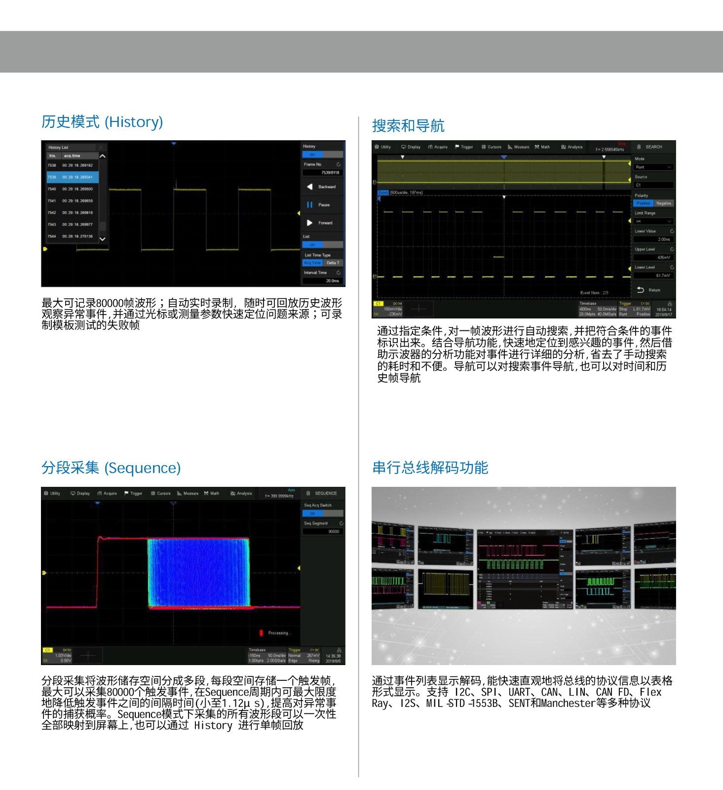 ■ 串行總線觸發(fā)和解碼器,標準支持協(xié)議 I2C、SPI、UART、CAN、LIN、CAN FD、FlexRay、I2S、MILSTD-1553B、SENT、Manchester 和 ARINC429。